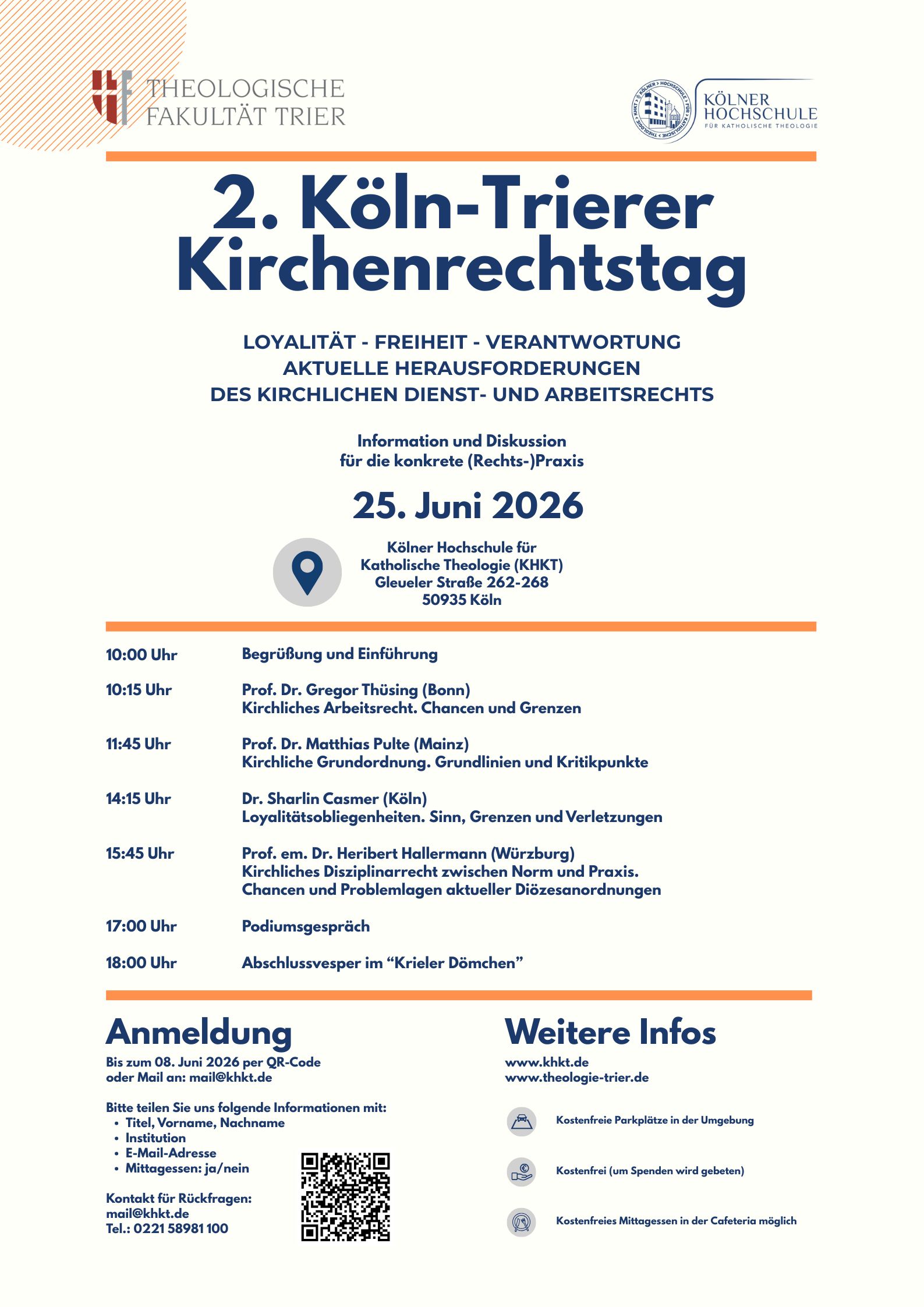Die Tagung widmet sich aktuellen Fragen des Kirchenrechts und bietet ein Podium für den Austausch zwischen Wissenschaft, Studium und Praxis. Angesichts der gegenwärtigen Transformationsprozesse stellt sich die Frage, nach dem Beitrag des Kirchenrechts, um das kirchliche Leben in der Spannung zwischen Identität (Tradition) und Relevanz (aktuelle Fragen), zwischen weltkirchlicher Universalität und ortskirchlicher Partikularität zu unterstützen. Die Bedingungen für die Anerkennung als Studienleistung werden in der Veranstaltung bekannt gegeben.